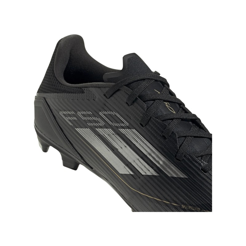Botas de fútbol Adidas League FG/MG Dark Spark en negro y gris, diseñadas para un control de balón superior y una mayor área de contacto. Ligeras, cómodas y duraderas, con cordones normales para un ajuste perfecto, inspiradas en el juego de Mohamed Salah.